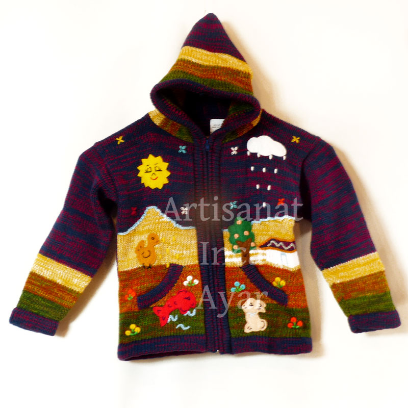 La veste péruvienne en laine que nous présentons ici est brodée à la main, chaque modèle de gilet ou pull pour enfant est donc unique et appartient à l’artisanat traditionnel de la région de Cusco au Pérou.