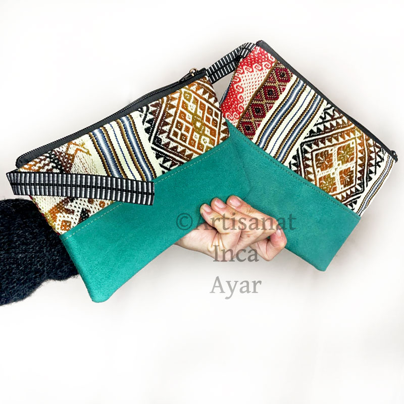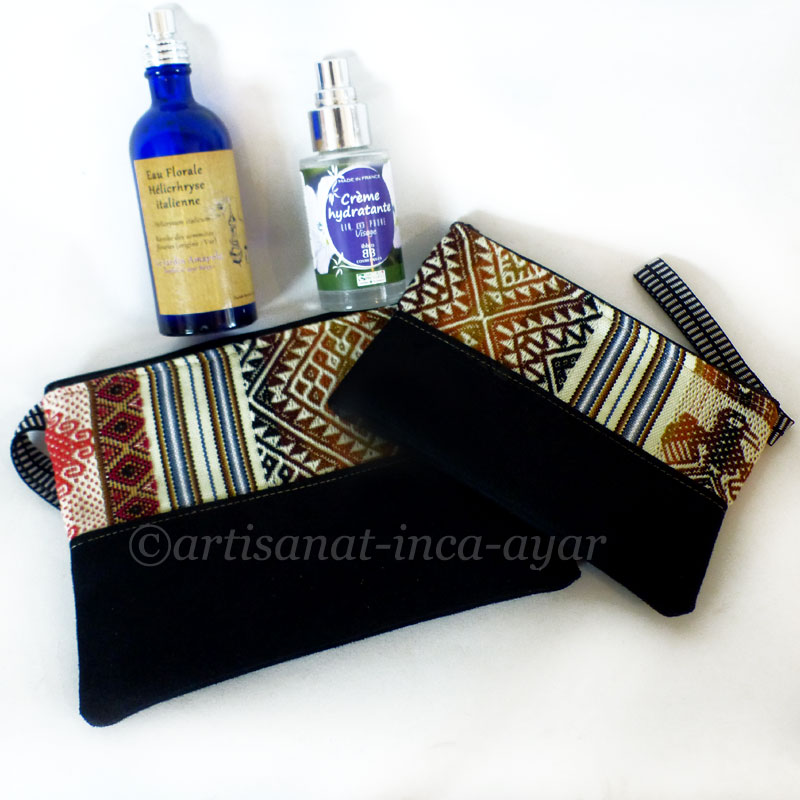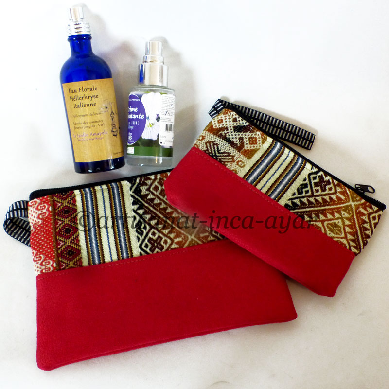 Lot de deux pochettes assorties – coloris au choix. Ces pochettes cousues main sont faites de tissus péruviens et de velours type daim.