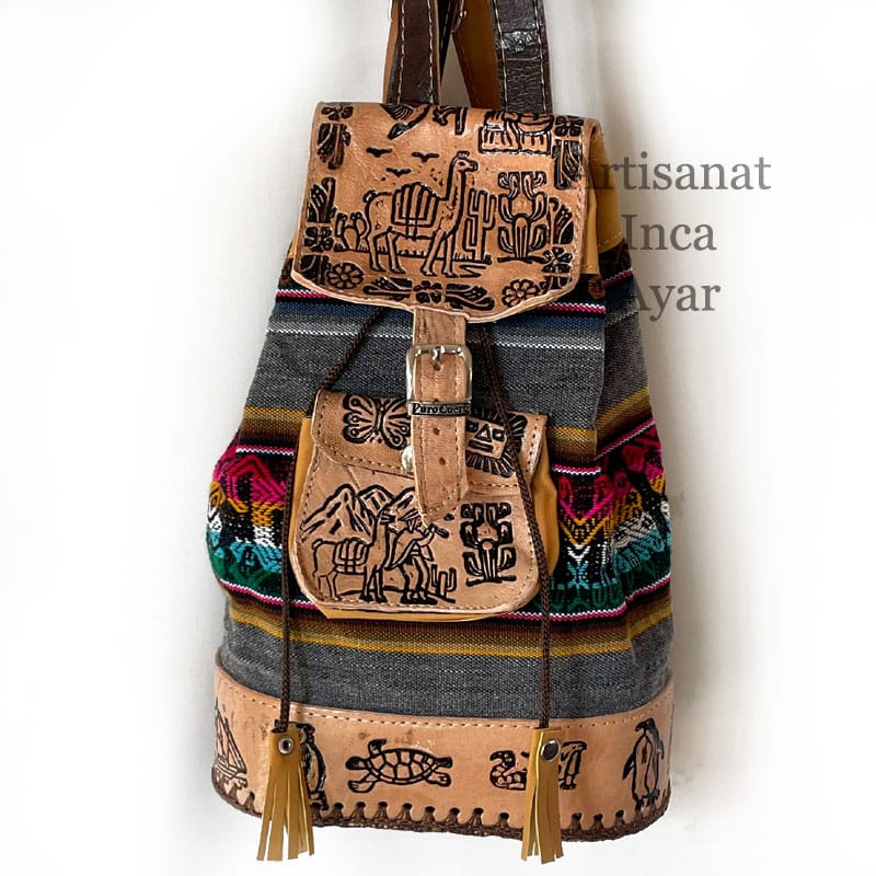 Sac à dos moyen en cuir et tissu péruvien – coloris au choix